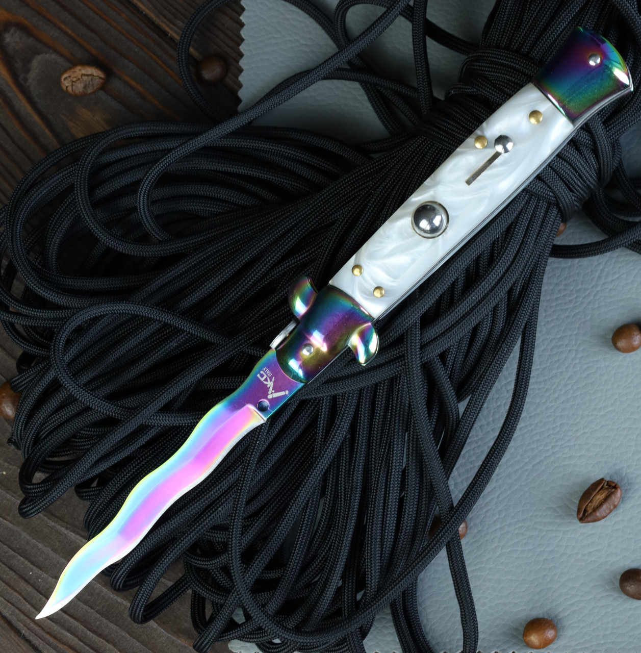 Хороші матеріали та якість збірки, запобіжник від випадкового відкриття, лезо із нержавіючої сталі та акрилові/дерев'яні накладки.